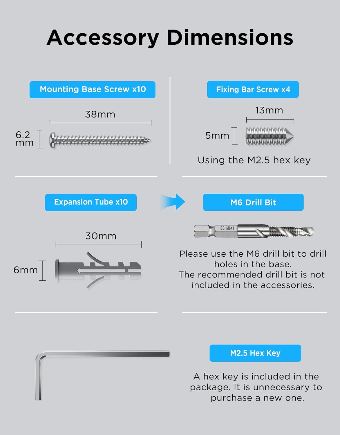 یک کلید شش گوش در بسته موجود است. خرید یک نمونه جدید ضروری نیست. اندازه پیچ میلهای ثابت: قطر ۵ میلیمتر، ارتفاع ۱۳ میلیمتر، اندازه پیچ پایه نصب: میخ: قطر ۴ میلیمتر، ارتفاع ۳۵ میلیمتر، مهره: قطر ۶.۲ میلیمتر، ارتفاع ۲.۶ میلیمتر، اندازه لوله انبساط: قطر ۶ میلیمتر، ارتفاع ۳۰ میلیمتر، لطفاً از مته M6 برای ایجاد سوراخ در پایه استفاده کنید، مته توصیه شده در لوازم جانبی موجود نیست.